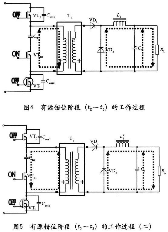 3)有源鉗位階段(t2~t3),如圖4和圖5所示,在亡2時刻鉗位開關(guān)管VTR在ZVS狀態(tài)下開啟,由于VTR1的體二極管先前已開通,VTRl的UDS電壓很低。鉗位開關(guān)管VTR1在整個階段處于開通狀態(tài),變壓器勵磁電流經(jīng)過鉗位開關(guān)管VTR1繼續(xù)給鉗位電容CR1充電,鉗位電容CR1充滿以后經(jīng)變壓器勵磁電感放電。次級在整個階段由L1續(xù)流經(jīng)VD2給負載供電,VD1截止。