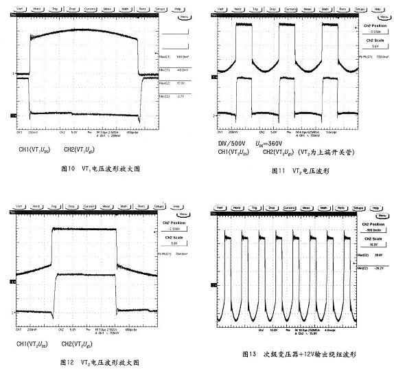 實際波形結(jié)果我們實際用一般雙晶體管正激的產(chǎn)品經(jīng)過改進,將其調(diào)整為上述的有源鉗位方式,其實際的雙晶體管工作波形如圖9~圖12所示。