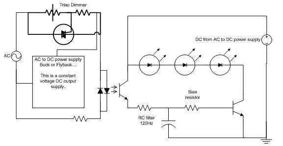 另一種方法是控制流經(jīng)LED串的電流量。這可能導(dǎo)致LED串的電壓下降,并造成輕微的色差。不過,如果觀察調(diào)光器打開情況下工作的白熾燈,也會(huì)看到明顯的色彩變化。