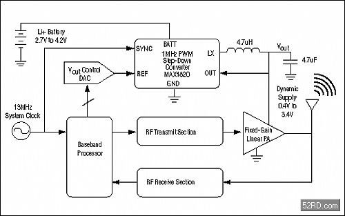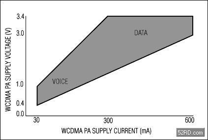 圖1.開關(guān)調(diào)節(jié)器(MAX1820)動(dòng)態(tài)調(diào)節(jié)W-CDMA功率放大器(PA)的電源。通過(guò)對(duì)功放電源的高效調(diào)節(jié),極大地降低了能量的消耗,延長(zhǎng)了手機(jī)電池的使用時(shí)間。