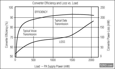 在很寬的負(fù)載范圍內(nèi)具有高效率—沒有高效率,采用開關(guān)型調(diào)節(jié)器就失去了意義,因此,高效率和省電是MAX1820的主導(dǎo)設(shè)計(jì)思想(見圖3)。傳送數(shù)據(jù)時(shí)(約500mW至2040mW),MAX1820內(nèi)部的低導(dǎo)通電阻(0.15Ω)PFET功率開關(guān)可以提供高達(dá)93%的效率。傳送話音時(shí)(約12mW至500mW),MAX1820內(nèi)部的0.2ΩNFET同步整流器和3.3mA的低工作電流(強(qiáng)制PWM模式)使轉(zhuǎn)換效率達(dá)到85%。85%的效率聽起來(lái)不算太高,但對(duì)于一個(gè)工作在1MHz恒定開關(guān)頻率和很輕負(fù)載的轉(zhuǎn)換器來(lái)講確非易事,正如圖3所示,轉(zhuǎn)換器具有極低的功率損耗。這要?dú)w功于優(yōu)秀的設(shè)計(jì)和亞微米工藝的采用,這種工藝能夠在給定的FET導(dǎo)通電阻下獲得更低的柵極電容。