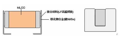 金屬端子通過接合材料(LF高溫焊接)與電容器的外部電極相結合,使金屬端子成為接合電路板的媒介。金屬端子的形狀采用能夠降低嘯叫效果的U字形。它只是與電容器上壓電效應比較小的WT面外側部分結合,從而減低電容器振動的傳遞。
