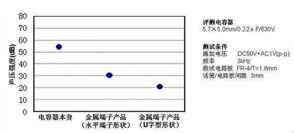 針對單個電容器的嘯叫,金屬端子電容器能夠大幅度的降低嘯叫強度。另外,若與使用低介電率材料的陶瓷電容結合,能更進一步降低嘯叫強度。