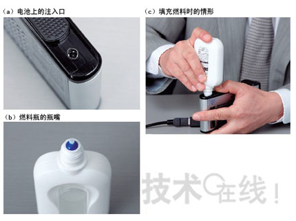 從位于底部的注入口向燃料電池填充燃料(a)。50mL裝燃料瓶由東洋制罐制造(b)。將瓶嘴插入電池的燃料注入口,只有對準(zhǔn)時,瓶嘴才會插入注入口里面注入燃料(c)。