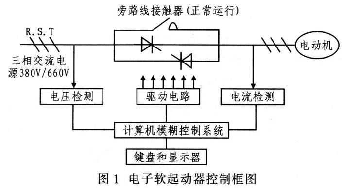 軟起動有磁控降壓軟起動器和電子軟起動器。其中,磁控降壓軟起動采用控磁限幅調(diào)壓方式減壓調(diào)控電動機(jī)起動時(shí)的電壓,實(shí)質(zhì)就是電抗器降壓起動。電子軟起動器有晶閘管調(diào)壓軟起動和變頻器調(diào)速軟起動。晶閘管調(diào)壓軟起動器的主回路采用6只晶閘管兩兩反向并聯(lián)組成的調(diào)壓電路,并焊接于電動機(jī)的三相供電線路。當(dāng)起動器的微機(jī)控制系統(tǒng)接收到起動指令后進(jìn)行有關(guān)計(jì)算。輸出晶閘管的觸發(fā)信號,通過控制晶閘管的導(dǎo)通角起動器按所設(shè)定的模式調(diào)節(jié)輸出電壓,從而控制電動機(jī)的起動。當(dāng)電動機(jī)起動完成后,起動器吸合旁路線接觸器,使晶閘管短路,電動機(jī)直接投入電網(wǎng)運(yùn)行,避免不必要的電能損耗。圖1為電子軟起動器控制框圖。