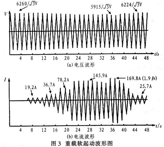 圖3為重載軟起動的電壓、電流波形。從圖3(a)電壓波形可見,電動機(jī)起動前系統(tǒng)電壓為
