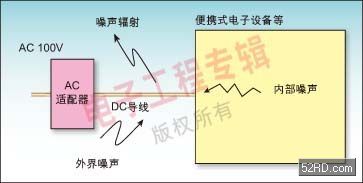 一般說來,便攜式電子設(shè)備內(nèi)部的噪聲是通過DC電源線以共模的方式輸出的,像在AC適配器導(dǎo)線上,其噪聲可以用共模噪聲濾波器進(jìn)行有效抑制。
