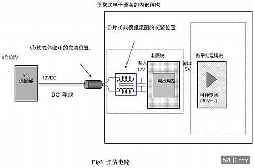 為了評(píng)估DC電源線上的EMI靜噪濾波器的噪聲抑制效果,我們做了一個(gè)模擬便攜式設(shè)備的評(píng)估電路板(如圖3所示)。它是通過AC適配器取得DC電源,同時(shí)配備了一個(gè)類似于電源功能塊的DC/DC轉(zhuǎn)換器電路,并安置了一個(gè)類似于內(nèi)部數(shù)字處理電路的時(shí)鐘動(dòng)作電路。