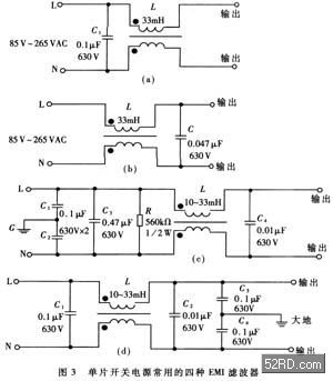為減小體積、降低成本,單片開(kāi)關(guān)電源一般采用簡(jiǎn)易式單級(jí)EMI濾波器,典型電路如圖3所示