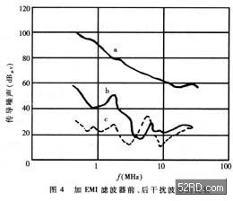 EMI濾波器能有效抑制單片開(kāi)關(guān)電源的電磁干擾。圖4中曲線(xiàn)a為不加EMI濾波器時(shí)開(kāi)關(guān)電源上0.15MHz~30MHz傳導(dǎo)噪聲的波形(即電磁干擾峰值包絡(luò)線(xiàn))。曲線(xiàn)b是插入如圖3(d)所示EMI濾波器后的波形,能將電磁干擾衰減50dBμV~70dBμV。顯然,這種EMI濾波器的效果更佳。[page]