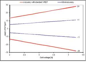 BM器件中常用的標(biāo)準(zhǔn)帶隙基準(zhǔn)源針對(duì)額定變化被校準(zhǔn),在25℃時(shí)的精度極高。然而,曲率形狀和位置變化的補(bǔ)償也相當(dāng)常見(jiàn),這就產(chǎn)生與溫度變化有關(guān)的大幅變化,使得在高和低溫時(shí)電池電壓測(cè)量不夠精確。此外,也不可能檢測(cè)和顯示出曲線(xiàn)形狀顯著不同的離群點(diǎn)。
