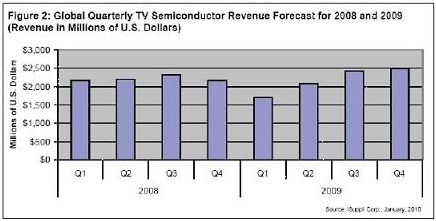2010年市場(chǎng)更加接受互聯(lián)網(wǎng)驅(qū)動(dòng)、支持LED背光和100/120Hz幀速率轉(zhuǎn)換技術(shù)等功能的先進(jìn)電視,將有利于推動(dòng)電視半導(dǎo)體市場(chǎng)達(dá)到新的高度。iSuppli公司目前預(yù)測(cè),2010年電視半導(dǎo)體營業(yè)收入將比2009年增長19%。