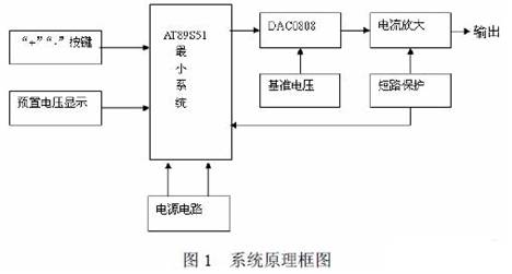 本系統(tǒng)是以AT89S51 單片機(jī)為核心控制器,具有電壓可預(yù)置、可步進(jìn)調(diào)整、輸出的電 壓信號(hào)和預(yù)置的電壓信號(hào)可同時(shí)顯示的數(shù)控直流電源,其硬件原理方框圖如圖1 所示。系統(tǒng) 由AT889S51 控制電路、鍵盤電路、電源電路、D/A 電路、功放電路、短路保護(hù)及報(bào)警電路、 穩(wěn)壓輸出電路、LED 顯示電路八部分組成。系統(tǒng)通過(guò)“開關(guān)”、“+”、“-”三個(gè)按鍵來(lái)控制預(yù)置電壓的升降,并通過(guò)數(shù)碼管顯示。AT89S51 單片機(jī)送出相應(yīng)的數(shù)字信號(hào),在D/A 轉(zhuǎn)換之 后輸出電流,經(jīng)集成運(yùn)放LM358 轉(zhuǎn)換、三極管放大、RC 網(wǎng)絡(luò)濾波,最終穩(wěn)定。同時(shí)由LED 數(shù)碼管顯示輸出電壓;由數(shù)字電壓表測(cè)量實(shí)測(cè)值。