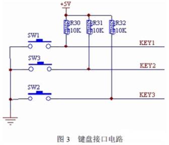 鍵盤接口電路如圖3 所示。鍵盤設(shè)計(jì)由三個(gè)按鍵控制即:“開關(guān)”鍵、“+”鍵、“-”鍵, 并外接三個(gè)上拉電阻控制鍵盤去抖。此三鍵分別連接到單片機(jī)的P1.0、P1.1、P1.2 接口進(jìn)行控制。