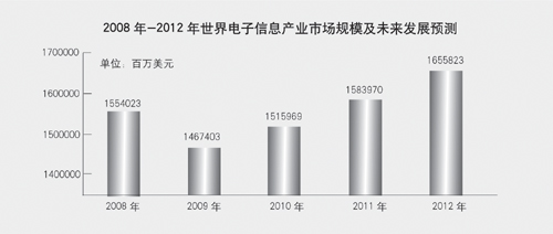 2010年,全球電子信息產業(yè)將逐步回暖并步入全面復蘇階段。根據《世界電子數據年鑒》預測,未來3年,全球電子信息產業(yè)市場規(guī)模將維持3%-4%的增幅,預計2010年市場規(guī)模將達到15159.7億美元,2012年將達到16558.2億美元。同時,未來3年信息技術應用將進一步深化,信息技術的廣泛滲透和深度應用將催生出一批新的增長點;綠色IT將成為未來發(fā)展重點,綠色信息技術在節(jié)能減排、低碳經濟中將發(fā)揮重要作用;企業(yè)并購重組步伐加快,新興市場拓展將成為電子信息產業(yè)發(fā)展的另一個重要引擎。