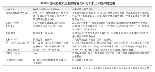 2009年,世界主要IT企業(yè)為應對國際金融危機,紛紛通過并購戰(zhàn)略整合優(yōu)勢資源,開拓新興市場,實施產品多元化發(fā)展,從而提升行業(yè)戰(zhàn)略地位和自身的競爭力。未來3年這種發(fā)展態(tài)勢仍會繼續(xù)。