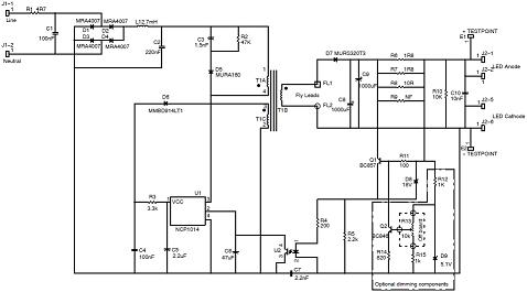 安森美半導體的NCP1014LEDGTGEVB評估板經過了優(yōu)化,可以驅動1到8顆大功率高亮度LED,如CreeRebel、SeoulSemiconductorZ−Power®或OSRAMGolden?XR−E/XP−E、Luxeon™?XLAMP®Dragon™。這設計基于集成了帶內部限流功能的高壓電源開關的緊湊型固定頻率脈寬調制(PWM)轉換器NCP1014構建。由于NCP1014采用固定頻率工作,電流不能上升到高于某個特定點;這個點由輸入電壓及開關周期或導通時間結束前的初級電感來確定。由于導通時間的限制,輸入電流將跟隨輸入電壓的波形,從而提供更高的功率因數。相關電路圖見圖2。