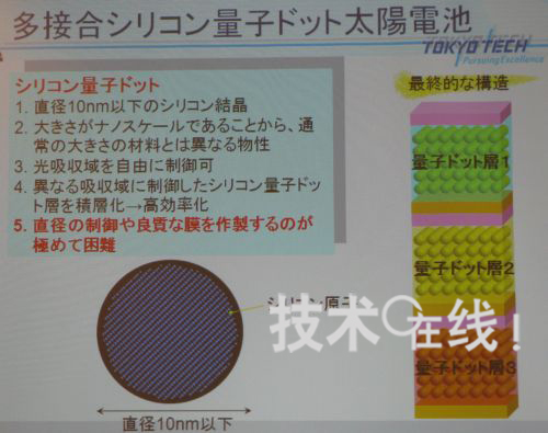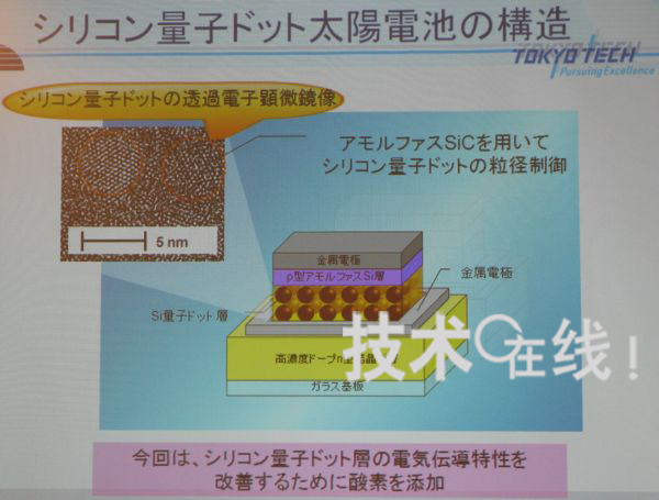 東京工業(yè)大學(xué)教授小長(zhǎng)井誠(chéng)研究小組,大幅提高了利用硅量子點(diǎn)的太陽(yáng)能電池的開(kāi)放電壓(Voc)及I-V特性形狀因子(FF)數(shù)值。2010年3月10日,該消息是在應(yīng)用物理學(xué)會(huì)舉行的2010年春季應(yīng)用物理學(xué)會(huì)學(xué)術(shù)演講會(huì)的會(huì)前新聞發(fā)布會(huì)上宣布的。
