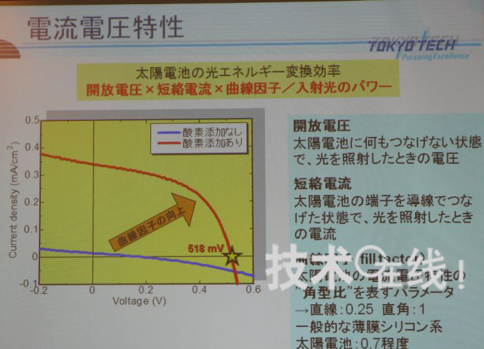 此次,小長(zhǎng)井研究小組的產(chǎn)官學(xué)合作研究員黑川康良宣布,通過(guò)向位于硅量子點(diǎn)周?chē)姆蔷iC層添加氧,以防止SiC的結(jié)晶化等,元件的Voc和FF值分別達(dá)到了518mV和0.51。據(jù)稱(chēng),此前的硅量子點(diǎn)太陽(yáng)能電池,澳大利亞新南威爾士大學(xué)(New South Wales University)教授M. Green小組發(fā)布的Voc=492mV為最高值。“我們的目標(biāo)是達(dá)到700~1000mV”(黑川)。