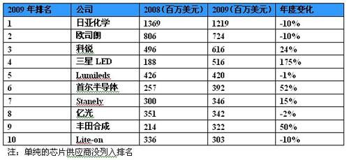 以個別廠商營收觀察,較早切入大尺寸背光市場的LED供應商,營收都在金融 海嘯中逆勢成長,例如韓國SamsungLED、首爾半導體 、日本廠商豐田合成等廠商。在營收排名上,2009年日亞化仍居全球第1名。其次是OSRAMOpto.與CREE等傳統(tǒng)LED大廠,臺灣廠商光寶、億光也都入榜前10名。