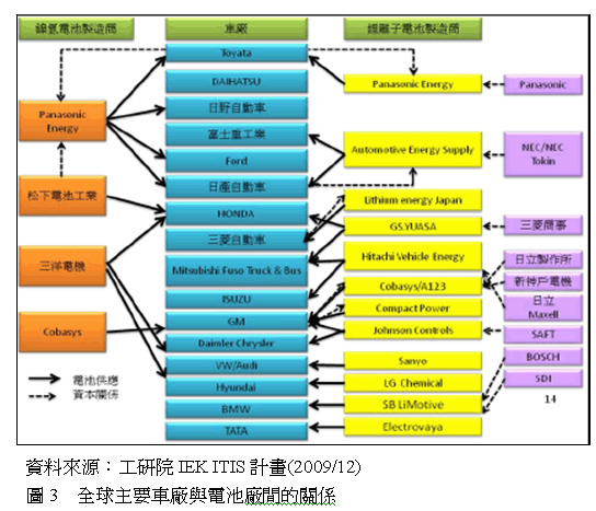 全球車用電池廠商以Sanyo、Cobasys、Panasonic為首,而隨著HEV、PHEV、EV..等話題不斷的吵熱,也吸引越來越多廠商投入市場。當前電池芯廠商的家數(shù)相較於全球車廠的家數(shù)少,所以車廠與電池芯廠間如何取得合作關係以確保電池芯的來源就相當重要。當前各家車廠與電池芯廠的合作關係如圖3,當前重點的歐美、日系以及韓系的車廠都己有確切的合作結盟廠商。