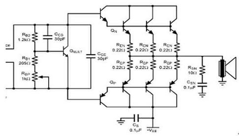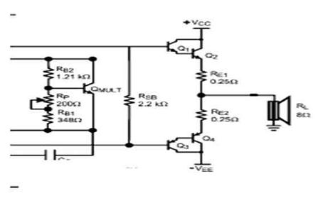改善交越失真的最有效方法便是減少RE的電阻。對于相同數(shù)值的RE,一個平行形式的輸出可降低用來改善線性度的整體RE電阻值。同時(shí),假如每一個級的RE都較大,那便可為輸出晶體管帶來更佳的匹配性和電流平衡。此外,RE也關(guān)系到輸出的功率損耗。對于一個相同的RE,較大的輸出電流會導(dǎo)致較大的功率損耗。RE的值取決于并聯(lián)輸出晶體管的數(shù)量和揚(yáng)聲器的負(fù)載。建議采用足夠功率的0.1到0.5Ω電阻器。