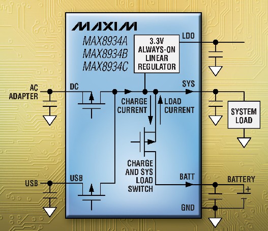 MAX8934可以采用獨立的USB和交流適配器電源輸入供電,也可用單個輸入連接兩種電源。直流輸入限流值最高可調(diào)節(jié)至2A,USB輸入限流值最高可調(diào)節(jié)至1.5A*。直流與USB輸入均支持100mA、500mA、1.5A和USB掛起模式。充電電流最高可調(diào)節(jié)至1.5A,支持較寬范圍的電池容量。器件的其它特性包括:防止過熱的熱調(diào)節(jié)環(huán)路、自適應電池充電功能在滿足系統(tǒng)負載供電的前提下為電池充電、OVP (過壓保護)、漏極開路充電狀態(tài)和故障指示輸出、電源就緒監(jiān)測器、充電定時器以及電池溫度監(jiān)測器。