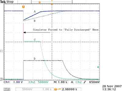 圖3根據(jù)圖2電池仿真電路繪制出的圖形,快速充電波形表明兩種條件下電池充電器的工作情況,分別是:CC階段提供1A(曲線B和D)和2A(曲線A和C)充電電流