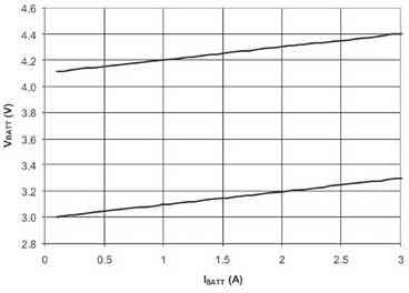 圖4圖2電路在電壓為4.1V(上部曲線)和3V(下部曲線)時的吸入電流,兩種情況下斜率均代表0.1Ω內(nèi)阻