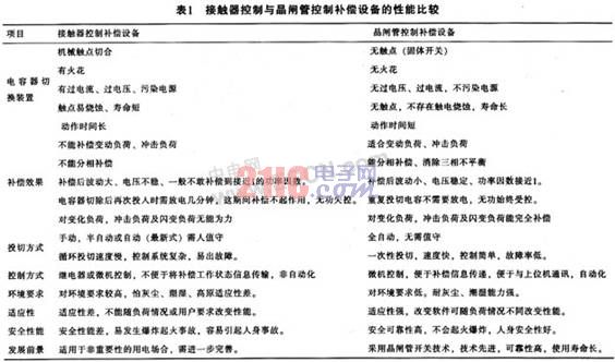 利用接觸器控制補償設(shè)備與用晶閘管控制方法來補償設(shè)備的性能比較如表1所列。