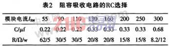模塊過壓保護一般也可采用阻容吸收法。對于持續(xù)時間較短,能量不大的過電壓,一般可在模塊兩端并聯(lián)阻容吸收電路,用吸收電容把過電壓的電磁能量變成靜電能量存貯起來。而用吸收電阻不但可以防止電路振蕩,還可限制晶閘管導(dǎo)通時電容放電所產(chǎn)生的開通損耗和di/dt值。并聯(lián)在晶閘管開關(guān)模塊的RC值可參考表2。