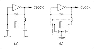 圖1給出了兩個皮爾斯振蕩器的實例。圖1a是一個典型的晶體振蕩電路,使用外部電容和電阻。圖1b則是一個基于三端陶瓷諧振器的皮爾斯振蕩器,陶瓷諧振器中集成了補(bǔ)償電容。這些設(shè)計中的每一個元件的值與工作頻率、供電電壓、反相器的類型、元件類型(晶體或諧振器)以及制造商有關(guān)。