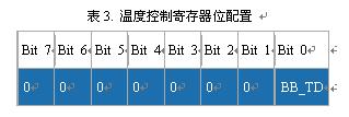 DS3234加入了溫度控制寄存器,當(dāng)器件由備用電源供電時(shí)可以禁止溫度更新。寄存器中的BB_TD位控制溫度測(cè)量禁止。該位上電時(shí)的默認(rèn)值為0,溫度更新功能有效。寄存器定義如表3所示。