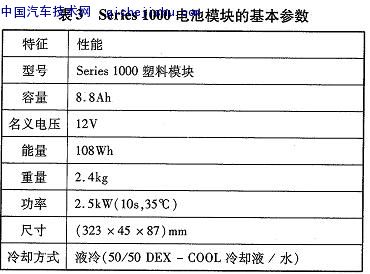Cobasys是ChevronTexacoTechnologyVenture(美國(guó)第二大能源公司)和ECD(EnergyConversionDevices)的合資公司。ECD全資控股Ovonic,Ovonic擁有很多關(guān)于鎳氫電池方面的專利,全世界生產(chǎn)鎳氫電池的企業(yè)須得到它的許可才能生產(chǎn)銷售oCobasys不僅只是技術(shù)的研發(fā),而且把研發(fā)的技術(shù)推廣到產(chǎn)業(yè)化的水平。Cobasys專門為混合動(dòng)力汽車開(kāi)發(fā)8.8Ah的Series1000電池模塊。其基本參數(shù)見(jiàn)表3。