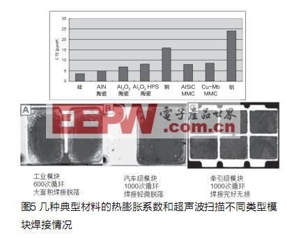 IGBT模塊由多層不同材料組成(見(jiàn)圖3),每種材料具有不同的CTE(熱膨脹系數(shù)),CTE的差別會(huì)影響功率模塊的使用壽命,當(dāng)模塊使用時(shí),溫度的變化會(huì)在不同層間產(chǎn)生機(jī)械應(yīng)力而導(dǎo)致焊接脫落,我們的目標(biāo)是選用熱膨脹系數(shù)差別盡可能小的材料來(lái)進(jìn)行焊接組合。但另一方面,即使它們的熱膨脹系數(shù)十分匹配,因?yàn)椴牧媳旧淼某杀究赡軙?huì)太高,或者在生產(chǎn)過(guò)程中難以被加工或加工成本太高。例如列車(chē)牽引應(yīng)用中的AlSiC基板。熱膨脹系數(shù)和襯底幾乎相同,因此有更好的熱循環(huán)特性。但對(duì)混合動(dòng)力車(chē)應(yīng)用因成本過(guò)高而很難被接受。