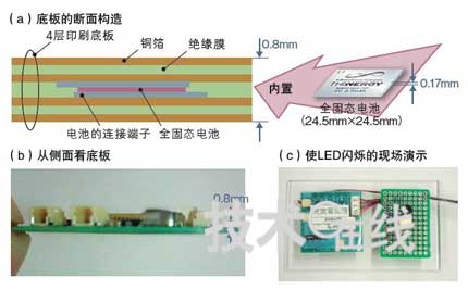 沖Printed Circuits在厚度為0.8mm的4層印刷底板上內置了IPS開發(fā)的厚0.17mm的全固態(tài)鋰離子充電電池(a,b)。