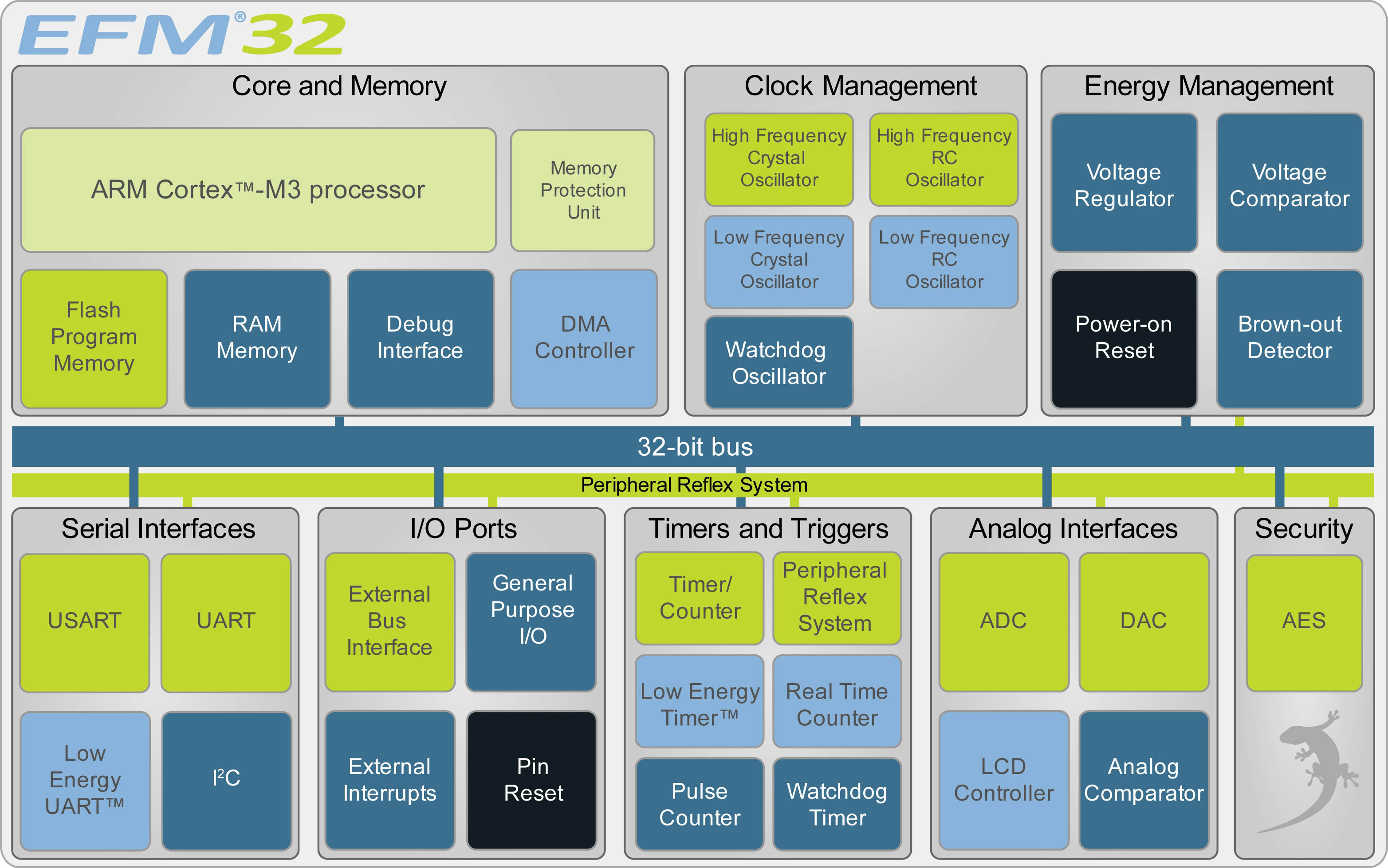 圖2:基于EFM32 Gecko 微控制器的Energy Micro的ARM ®Cortex™- M3芯片架構(gòu)。