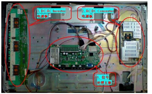 圖2:傳統(tǒng)式LCDTV內(nèi)置信號(hào)處理、AC/DC電源、DC/AC電源三塊PCB板。