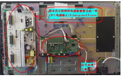 23英寸及以下的小尺寸LCDTV由于整機(jī)功率通常小于75W,不需要配置PFC線路,其供電模塊的設(shè)計(jì)和制造已經(jīng)相對成熟,早期分立的AC/DC主電源板和DC/AC逆變電源板出于降低制造成本的考慮已經(jīng)被整合到一塊PCB板上,即目前主流的LIPS(LCDIntegratedPowerSystem)結(jié)構(gòu),昂寶電子針對此類應(yīng)用開發(fā)了多款LIPS電源,AC/DC部分轉(zhuǎn)換電路主要使用OB2263、OB2269和OB2202等芯片,DC/AC部分逆變器電路主要采用OB3316、OB3318和OB494P等芯片,小尺寸LCDTV內(nèi)部只有電源板和信號(hào)處理主板兩塊PCB,而對于32英寸以上大尺寸LCDTV而言,其內(nèi)部會(huì)相對復(fù)雜。