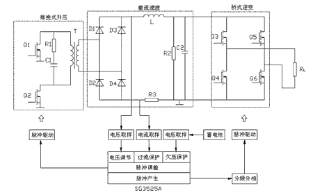 本逆變器輸入端為汽車蓄電池(+12V,4.5Ah),輸出端為工頻方波電壓(50Hz,220V)。其系統(tǒng)主電路和控制電路框圖如圖1所示,采用了典型的二級變換,即DC/DC變換和DC/AC逆變。12V直流電壓通過推挽式變換逆變?yōu)楦哳l方波,經(jīng)高頻升壓變壓器升壓,再整流濾波得到一個穩(wěn)定的約320V直流電壓;然后再由橋式變換以方波逆變的方式,將穩(wěn)定的直流電壓逆變成有效值稍大于220V的方波電壓,以驅動負載。為保證系統(tǒng)的可靠運行,分別采集了DC高壓側電壓信號、電流信號及蓄電池電壓信號,送入SG3525A,通過調整驅動脈沖的占空比或關斷脈沖來實現(xiàn)電壓調節(jié)、過流保護及欠壓保護等功能。
