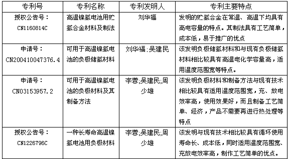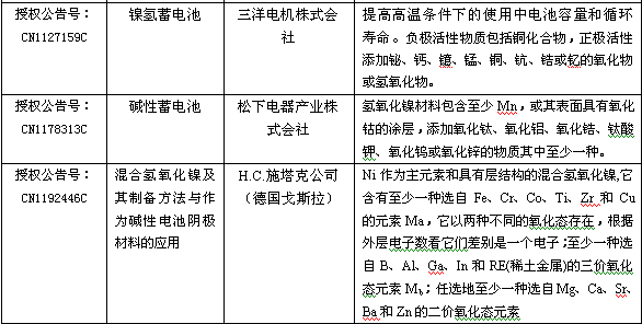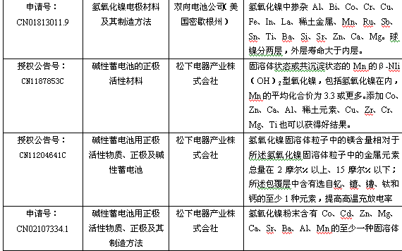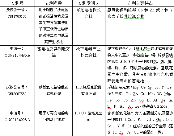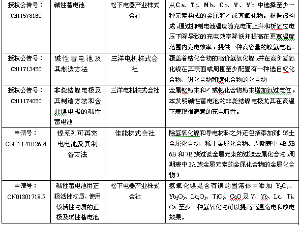 在電池配料時,通過機(jī)械混合法添加周期表中ⅡA、ⅢB、ⅣB、ⅦB、ⅧB、ⅡB主族元素和3、4、5周期的元素、氧化物或氫氧化物,能較好地提高或改善鎳氫高溫性能。世界著名電池制造公司在華申請授權(quán)的專利中多有介紹,如日本松下、三洋;中國比亞迪;德國H.C.施塔克等公司。詳細(xì)見下表: