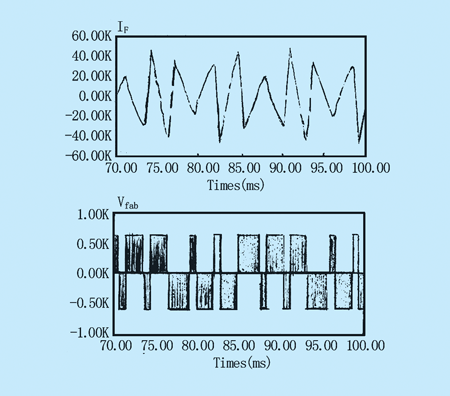 帶自控直流母線的并聯(lián)APF,有一類似于靜態(tài)補(bǔ)償器(STATCOM)的拓?fù)?,STATCOM是用于電力系統(tǒng)中補(bǔ)償無功功率的。并聯(lián)的APF,以注入相等而反向的諧波電流對負(fù)荷電流的諧波進(jìn)行補(bǔ)償。此時,并聯(lián)APF是作為注入諧波分量的電流源而工作的,諧波分量由負(fù)荷產(chǎn)生,但已移相180o。圖4為并聯(lián)APF的接線圖,圖5表示APF補(bǔ)償?shù)墓ぷ髟?。為能輸出圖5所示濾波器電流波形的IF,需要設(shè)置圖4中的控制電路,以便產(chǎn)生圖6所示的Vfab脈寬調(diào)制電壓圖。