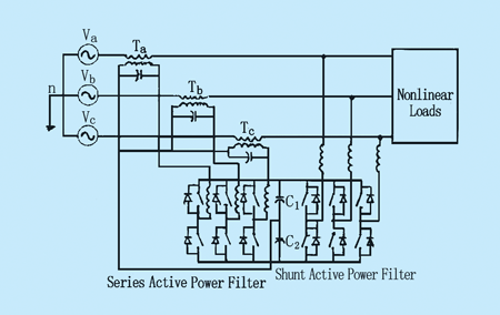 串聯(lián)型APF是從1980年未引用于電網(wǎng)的,它主要作為電壓調(diào)節(jié)器及電網(wǎng)與非線性負(fù)荷之間的諧波隔離器而工作的。圖7為串聯(lián)APF的接線圖,通過匹配變壓器將APF串聯(lián)于電源和負(fù)荷之間,以消除電壓諧波、平衡或調(diào)正負(fù)荷的端電壓,可確保用戶供電的電壓質(zhì)量,尤其適合于補(bǔ)償交流電源及小功率應(yīng)用中的電壓不平衡與電壓的下陷。因不需能量貯備(蓄電池),元器件的總定額較小,對UPS更為經(jīng)濟(jì)有效。串聯(lián)APF注入與電源電壓串聯(lián)的電壓分量,故可視為一可控的電壓源,補(bǔ)償負(fù)荷側(cè)的電壓下陷和上凸。但串聯(lián)型APF損耗較大,且各種保護(hù)電路也較復(fù)雜,故很少單獨使用。經(jīng)常用它與無源LC濾波網(wǎng)絡(luò)組成混合型APF。