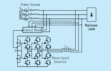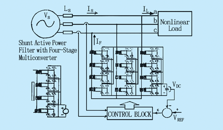 一直處于研究階段的多級逆變器,最近被用于APF拓?fù)渲?,圖11為配有三級逆變器的并聯(lián)APF,今天在大多數(shù)的逆變器應(yīng)用領(lǐng)域,三級逆變器已愈益普及,例如功率因數(shù)補(bǔ)償器。多級變換器的優(yōu)點是能降低APF產(chǎn)生的諧波含量。因與普通變頻器比較,能輸出更多(>2級)的電壓,這一特點有利于減少濾波器本身產(chǎn)生的諧波。另一優(yōu)點是能減少半導(dǎo)體電壓或電流的定額,以及減少所需的開關(guān)頻率。