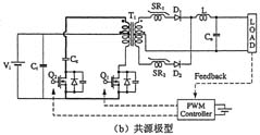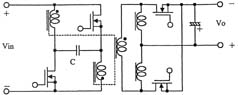 另外,如圖3所示,在采用絕緣變壓器的場合,研究人員還提出了將有源鉗位電路嵌入推挽式轉(zhuǎn)換器中的方案,可在采用48V輸入和1.2V/70A輸出的條件下實現(xiàn)高達(dá)91%的效率。上面講到的幾種電路方式基本上都是一段式結(jié)構(gòu),最近,出于進(jìn)一步提高效率的考慮,人們正在加緊研發(fā)兩段式結(jié)構(gòu)的轉(zhuǎn)換器。就普通的轉(zhuǎn)換器而言,采用兩段式結(jié)構(gòu)將導(dǎo)致效率下降是人所共知的常識,然而,在低電壓大電流轉(zhuǎn)換器中,對輸出進(jìn)行同步整流是很普遍的做法,因此,如何實現(xiàn)同步整流操作的高效化便成為了關(guān)鍵所在。