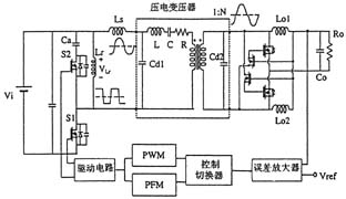 日本的研究人員開發(fā)成功一種振動型壓電變壓器,其厚度僅為4mm。該壓電變壓器的驅(qū)動電路采用方波逆變器,通過改變其開關(guān)頻率(PFM方式)以達(dá)到借助壓電變壓器的諧振特性來調(diào)整輸出電壓的目的。但是,由于壓電變壓器具有多種由其形狀所決定的諧振頻率,所以很難通過大幅度地改變頻率的做法來控制輸出電壓。為此,人們正在研究引入逆變器的脈寬調(diào)制(PWM)技術(shù)。圖7示出了通過將驅(qū)動用逆變器、采用電流倍增器的整流電路以及采用PFM和PWM方式的混合控制電路與壓電變壓器相連而構(gòu)成的壓電變壓器DC/DC轉(zhuǎn)換器。