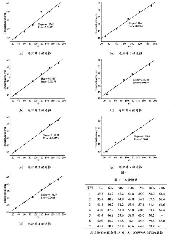 為了驗證遮擋造成的溫度變化,我們在實驗室進行了測試來加以驗證。如圖3(a)~圖3(g)所示,是在實驗室模擬陽光照射,對一塊多晶硅太陽電池組件隨機挑選7塊硅片遮蓋所作的升溫實驗曲線圖表,用Origin7.0軟件進行的擬合: