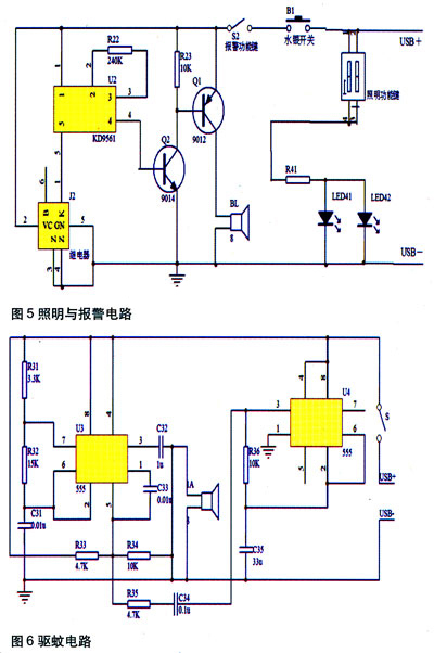 如圖5所示,當(dāng)按下預(yù)報(bào)警功能鍵時(shí),USB輸出電壓加載在報(bào)警系統(tǒng)上,此時(shí)移動(dòng)隨身電源處于"預(yù)報(bào)警"狀態(tài)。當(dāng)水銀開關(guān)B1位置偏移正常的斷開位置,將觸發(fā)繼電器工作,使KD9561音樂片工作,發(fā)出報(bào)警響聲,提醒注意安全。