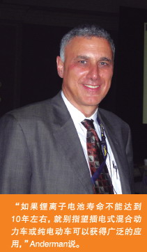 “如果鋰離子電池壽命不能達到10年左右,就別指望插電式混合動力車或純電動車可以獲得廣泛的應(yīng)用,”Anderman說。