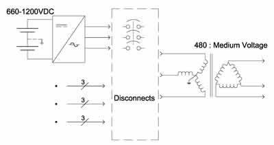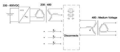 一個(gè)在設(shè)施入口處低壓一端擁有連接點(diǎn)的1兆瓦的商用屋頂系統(tǒng)需要1至4個(gè)并網(wǎng)光伏逆變器。采用傳統(tǒng)的逆變器時(shí),每一個(gè)都必須與一個(gè)單獨(dú)的或定制的隔離變壓器相搭配——不論變壓器與逆變器是否集成,情況都是如此。因此,電力供應(yīng)立即被減弱了,因?yàn)楦綦x變壓器的效率通常只有98%到99%,它們最多可以讓效能下降2%。